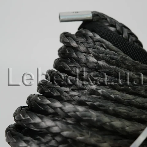 Синтетичний трос поставляється в комплекті з алюмінієвим клюзом та гаком. Він виготовлений з кевлару, розрахований на експлуатацію в агресивному середовищі, не схильний до деформацій. Трос стійкий до стирання, забезпечує підвищену безпеку при намотуванні під навантаженням. Завдяки алюмінієвому клюзу забезпечується правильне та рівномірне намотування без заломів.